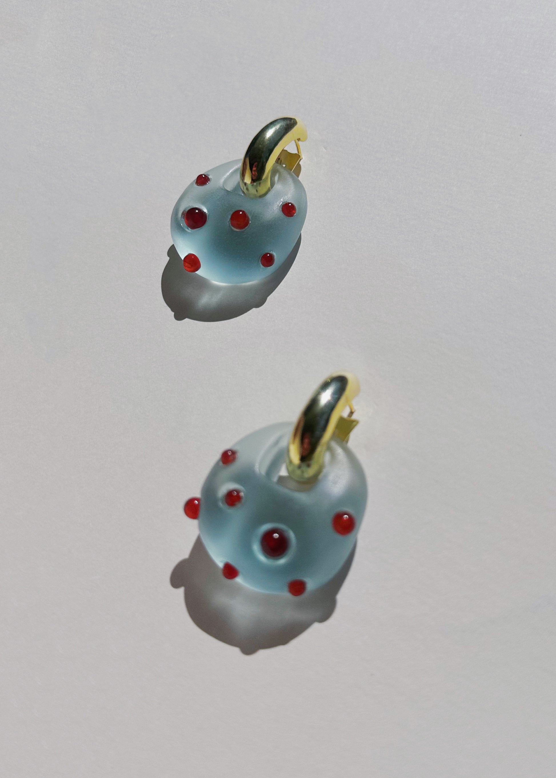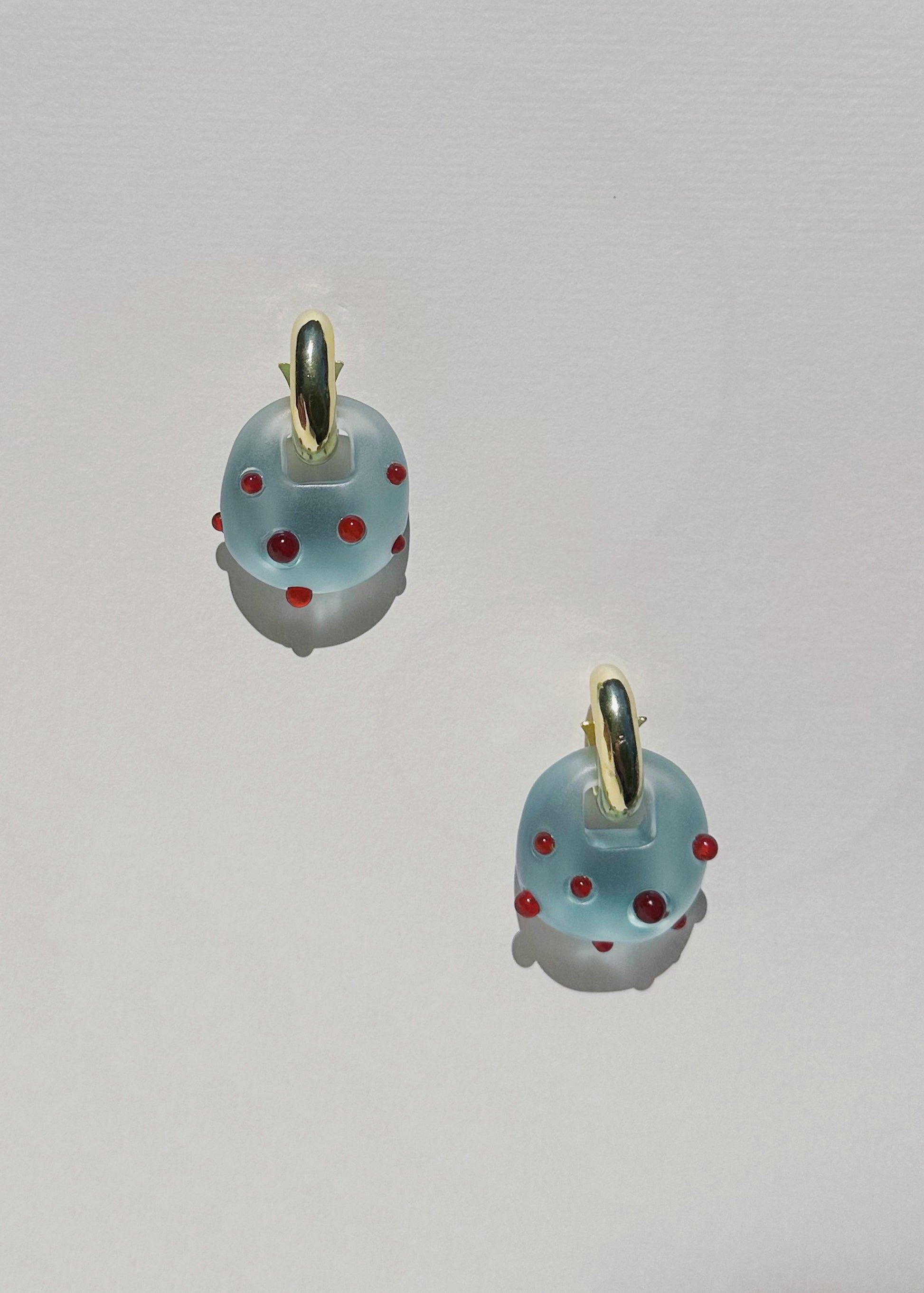 O Brinco Astral, nosso eterno clássico, é modelado à mão em um formato maior que o original. Nesta versão, a peça ganha tamanho e leveza em resina translúcida com aplicações de agata vermelha natural.